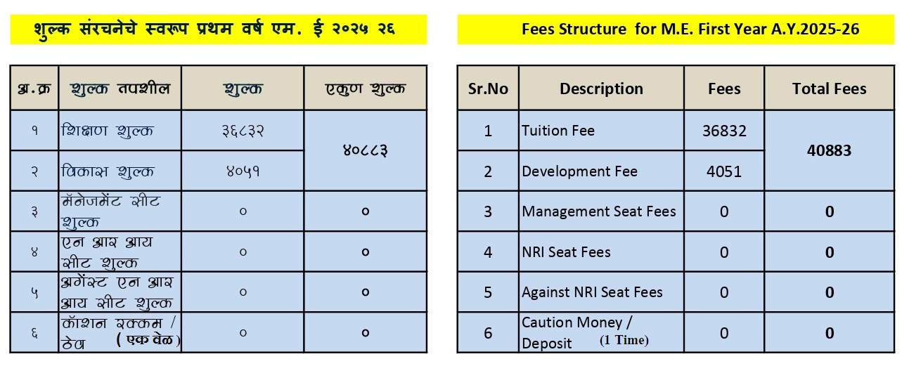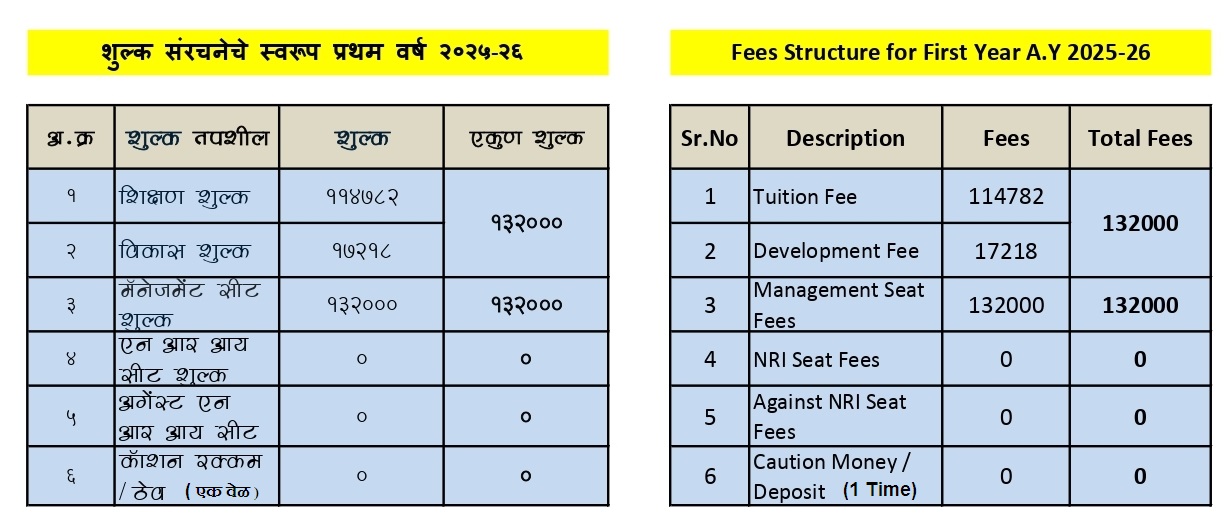 First Year Admission is a Centralized Procedure. The Centralized Admission Procedure (CAP) is carried out as per the guidelines of State Common Entrance Test Cell (CET Cell), Maharashtra State /Govt. of Maharashtra. For further information click on link www.mahacet.org The schedule or Centralized Admission Process (CAP) is notified by CET Cell, M.S. After the CAP rounds, admissions at vacant seats are done.