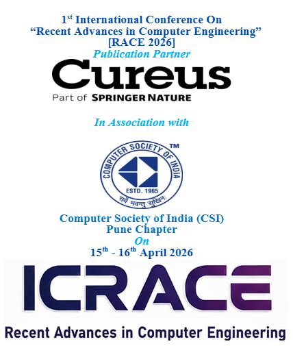 The st International Conference on Recent Advances in Computer Engineering (IC - RACE-2026) is a premier global forum dedicated to showcasing cutting-edge research, innovative solutions, and emerging trends in the field of Computer Engineering and allied disciplines. The conference aims to foster knowledge exchange, encourage interdisciplinary research, and strengthen collaboration between academia, industry, and research organizations. RACE-2026 will bring together distinguished researchers, academicians, scientists, industry experts, and students to discuss advancements in areas such as Artificial Intelligence, Data Science, Cyber Security, Cloud Computing, IoT, and other evolving technologies. The conference will feature keynote talks by eminent speakers, technical paper presentations, and interactive sessions designed to promote professional networking and research partnerships. Organized in association with the CSI Pune Chapter, the conference builds upon the institute’s strong academic foundation, having successfully conducted 12 National Conferences under the RACE series. Marking a significant milestone, RACE-2026 is the first International edition of this prestigious conference series. Selected and accepted papers will be published in the Cureus Journal of Engineering, a premier peer-reviewed publication covered by Springer Nature, subject to the journal’s editorial policies and review process."