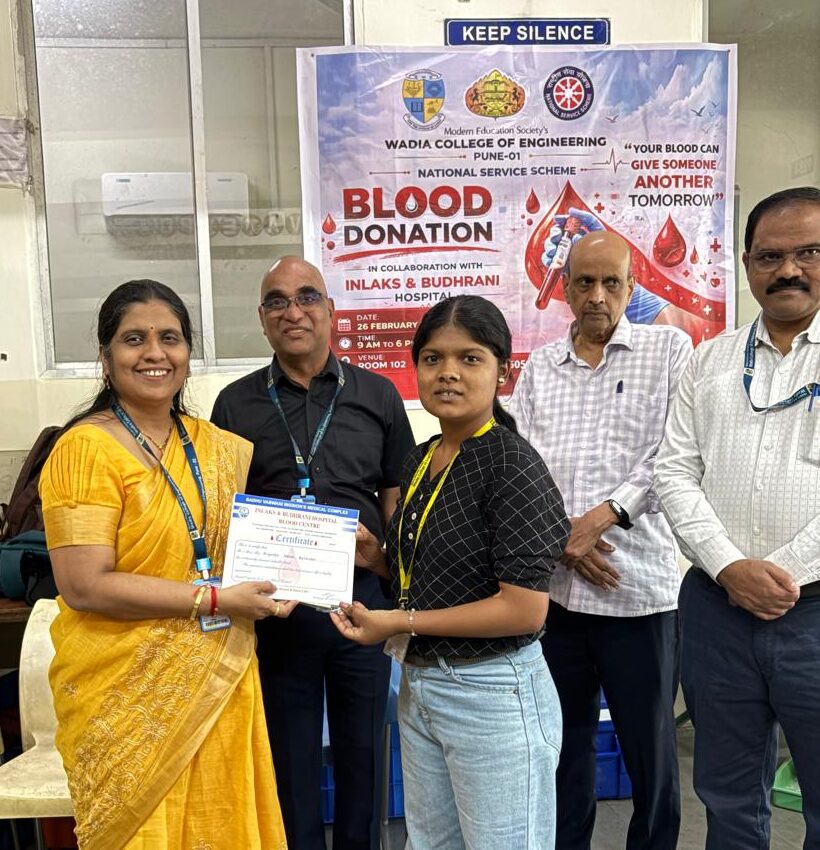 दिनांक : २६ / ०२ / २०२६ वाडिया अभियांत्रिकी महाविद्यालय, पुणे येथे एनएसएस विभागाच्या वतीने इनलॅक्स व बुधराणी हॉस्पिटल यांच्या सहकार्याने भव्य रक्तदान शिबिराचे आयोजन करण्यात आले. या शिबिरामध्ये एकूण 170 रक्तदात्यांनी रक्तदान करून समाजसेवेचा आदर्श निर्माण केला. या रक्तदान शिबिराचे उद्घाटन महाविद्यालयाच्या प्राचार्य डॉ. मनीषा डाले मॅडम यांच्या हस्ते करण्यात आले. यावेळी उपस्थित मान्यवर पुढीलप्रमाणे होते — एनएसएस अधिकारी डॉ. अजित सोनवणे सर, रजिस्ट्रार प्रा. संजय इंगोले सर, डॉ. प्रणोती माने मॅडम, डॉ. रायबोले सर, डॉ. चौगुले सर आणि डॉ. शेख मॅडम डॉ अडकर सर या शिबिरामध्ये विद्यार्थी, प्राध्यापक व एनएसएस स्वयंसेवकांनी मोठ्या उत्साहाने सहभाग घेतला. गरजू रुग्णांसाठी रक्तसाठा उपलब्ध होण्यास या उपक्रमामुळे मोलाची मदत झाली. कार्यक्रमाच्या यशस्वी आयोजनासाठी एनएसएस स्वयंसेवकांचे विशेष योगदान लाभले. उपस्थित मान्यवरांनी रक्तदात्यांचे व आयोजकांचे कौतुक करून अशा सामाजिक उपक्रमांचे सातत्य राखण्याचे आवाहन केले.
